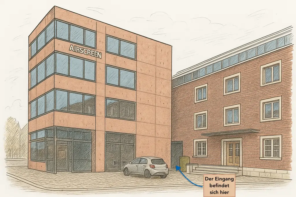 Der Eingang befindet sich zwischen dem Kubus und dem Backsteingebäude.